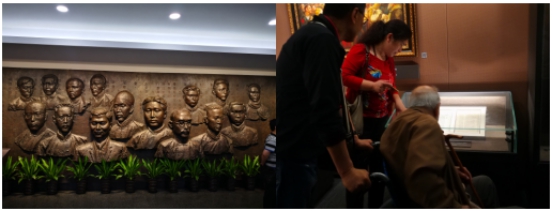 走進(jìn)"一大"會址,首先映入眼簾的是13位中共代表及2位共產(chǎn)國際代表銅頭像。他們是毛澤東、何叔衡、董必武、陳潭秋、王盡美、鄧恩銘、李達(dá)、李漢俊、張國燾、劉仁靜、陳公博、周佛海、包惠僧及荷蘭人馬林和俄羅斯人尼柯爾斯基,左手邊是巨幅黨旗,重溫入黨誓詞,激情澎湃,激蕩回響。忽然,我看見一位老人坐著輪椅被推到成列窗前,旁邊的女子大聲給老人講解并手指相片,可能老人耳朵聽不清,久久凝視,用顫抖的右手撫摸著放照片的成列窗玻璃,張張嘴,笑了。這一場景我的心顫了,我看到老人眼里含著淚笑,而我卻哭了……