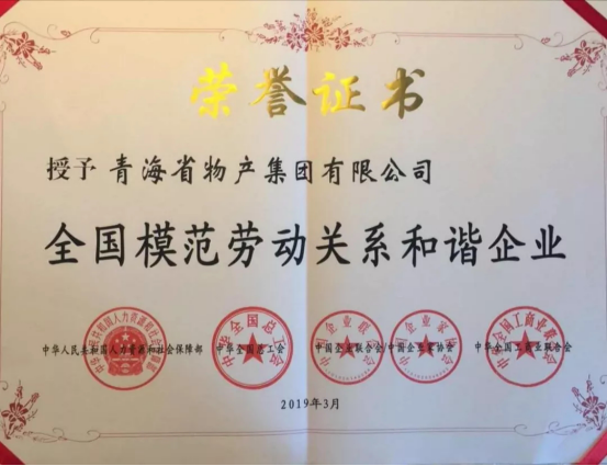 由青海省人力資源和社會保障廳、青海省總工會、青海省企業(yè)聯(lián)合會/企業(yè)家協(xié)會、青海省工商業(yè)聯(lián)合會共同推薦申報,青海省物產(chǎn)集團有限公司、青?;ブ囡乒煞萦邢薰尽⒄铰窐蚪ㄔO(shè)股份有限公司榮獲全國模范勞動關(guān)系和諧企業(yè)光榮稱號,西寧經(jīng)濟技術(shù)開發(fā)區(qū)東川工業(yè)園區(qū)榮獲全國模范勞動關(guān)系和諧工業(yè)園區(qū)光榮稱號,受到了國家人力資源和社會保障部、中華全國總工會、中國企聯(lián)、全國工商聯(lián)的隆重表彰。