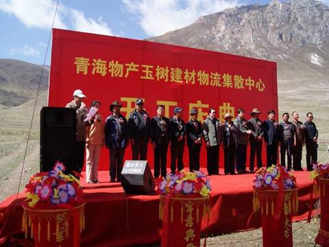 省玉樹地震災(zāi)后重建現(xiàn)場指揮部指揮長、副省長馬順清宣布建材物流集散中心正式開工并講話。省政府副秘書長巨偉、省經(jīng)委、省城鄉(xiāng)住房建設(shè)廳、西寧市政府、玉樹州政府相關(guān)部門、玉樹縣有關(guān)負責(zé)同志,省物產(chǎn)集團總經(jīng)理王玉輝、黨委書記白家林、副總經(jīng)理物產(chǎn)化工公司董事長耿保平等參加了開工儀式。