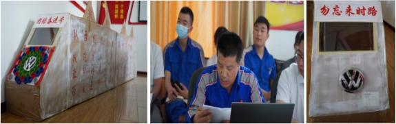 西柏坡精神是部生動的教科書,車間工人黨員袁有德利用平時裝配件的紙盒子,創(chuàng)意性地制做了一列"團結奮進號"火車,邀請黨員一起乘車前行。袁有德說:"團結奮進號"列車蘊含著學習西柏坡精神,強企富家、團結奮進的寓意,車頭前面的"大眾"標識代表公司經(jīng)營的品牌;八個綠色的大美孚機油蓋代表八方來財,所有蓋口都向外代表招攬客戶,減少流失,而且像螺絲釘一樣牢牢釘?。≤囶^車尾標有"勿忘來時路"的字樣,以此提醒廣大黨員干部不忘初心、牢記使命,一定不要忘記來時的路,回顧過去,展望未來,讓"團結奮進"號列車在西柏坡精神的感召下前行。支部要求,在疫情防控和汽車行車嚴竣的形勢下,我們每一個物產汽貿員工都是新時代的答卷者,讓"團結奮進號"奔馳在新時代的征程上,承載著中國夢、物產夢,承載著物產汽貿職工群眾對美好生活的向往,風馳電掣,勇往直前,奔向未來!