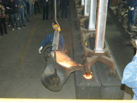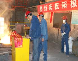 2012年7月7日上午11點(diǎn)零19分,青海物產(chǎn)工業(yè)投資有限公司10萬噸電解鋁/年升級(jí)改造項(xiàng)目,簡易陽極組裝車間大門前鞭炮齊鳴。青海物產(chǎn)工業(yè)投資有限公司黨總支副書記、青海長春炭素有限公司總經(jīng)理王松華,公司常務(wù)副總經(jīng)理、項(xiàng)目副總指揮常海寧,工業(yè)投資和長春炭素公司副總經(jīng)理姜紅萍,公司副總經(jīng)理張秉瑜,總經(jīng)理助理范登福等公司領(lǐng)導(dǎo)和各車間、部室的職工出席了簡單的點(diǎn)火澆鑄儀式。王松華同志按下了點(diǎn)火按鈕鄭重宣布澆鑄正式開始。當(dāng)中頻爐工將第一爐鐵水倒入抬包時(shí),標(biāo)志著新陽極組裝車間正式投產(chǎn)運(yùn)行。