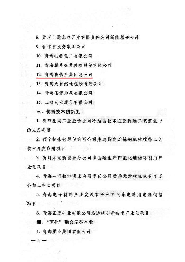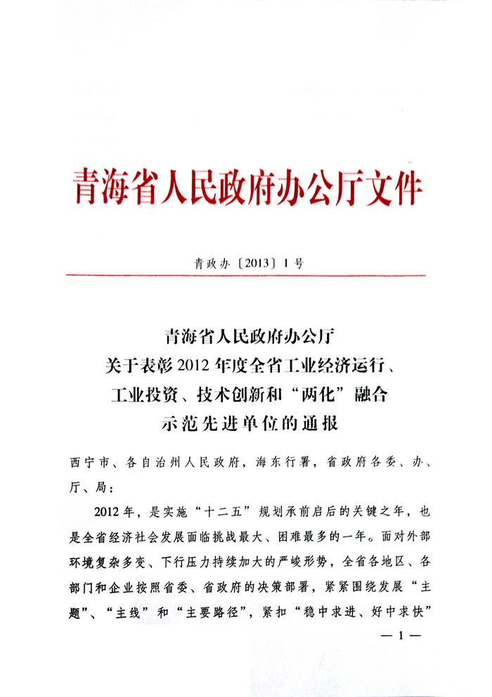 2012年,青海省物產(chǎn)集團(tuán)總公司在省委、省政府及省國(guó)資委的大力支持和領(lǐng)導(dǎo)下,集團(tuán)總公司按照全省工業(yè)經(jīng)濟(jì)總體部署和要求,著力推進(jìn)工業(yè)項(xiàng)目建設(shè),榮獲"2012年度工業(yè)投資貢獻(xiàn)獎(jiǎng)"。
